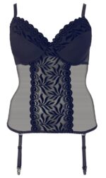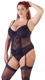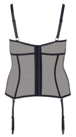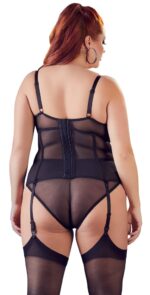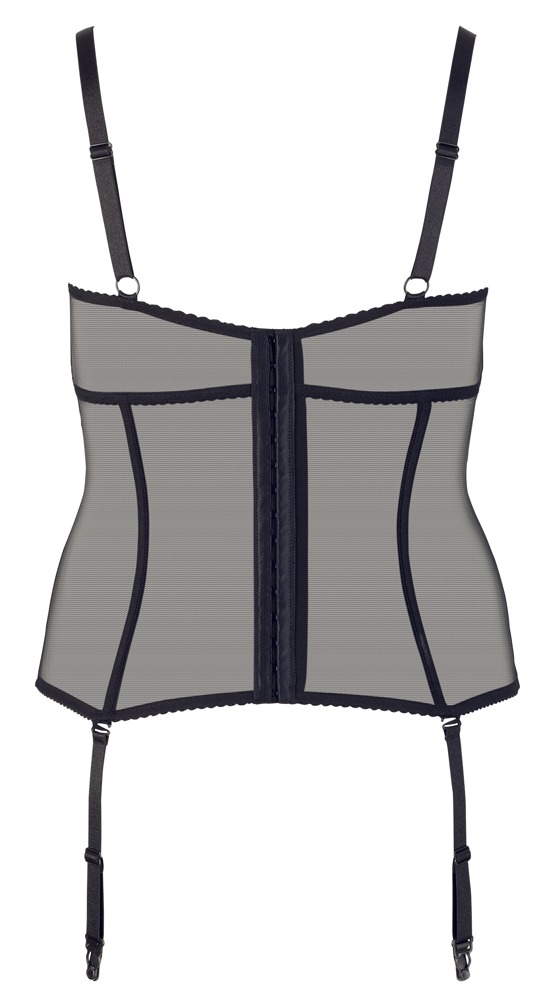 Female curves presented seductively!Basque made out of transparent powernet with extra wide straps, delicate flock print inserts at the slightly padded underwired cups and waist. Full-length hook fasteners at the back. Straps and suspender straps are adjustable and removable.Powernet 90% polyamide, 10% spandex; flock print 90% polyester, 10% spandex.