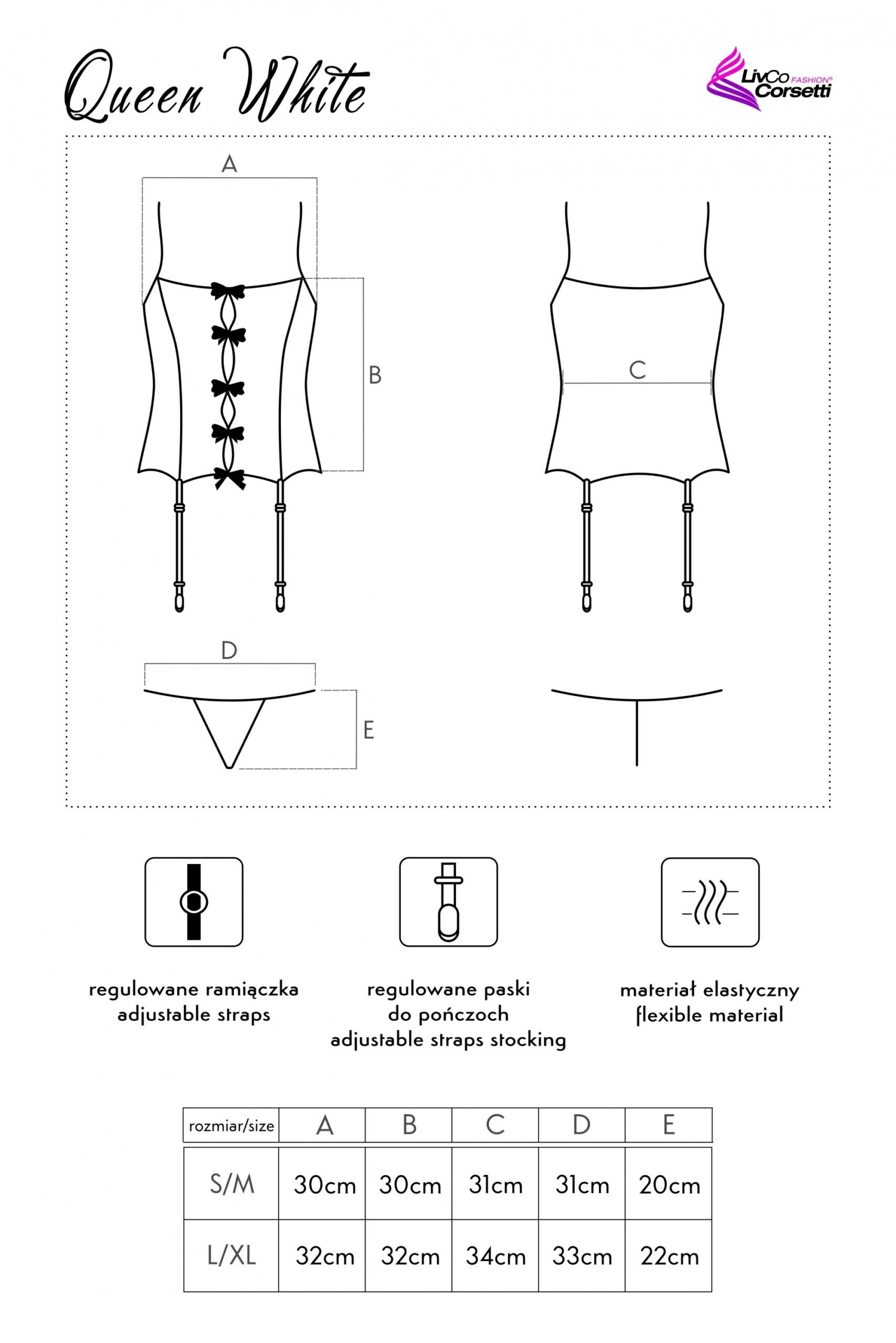 Zmysłowy komplet Queen White, w którego skład wchodzi gorset z koronką i uroczymi kokardkami, w komplecie ze stringami, to idealna propozycja dla Pań ceniących sobie wyjątkową bieliznę. Gorset wykonany jest z miękkiego i elastycznego materiału. Posiada regulowane ramiączka. Odpowiednio wyprofilowane miseczki pięknie eksponują walory kobiecego piękna, a kokarda i koronka dodają kompletowi romantyzmu i uroku. Stringi posiadają z przodu koronkę, tworząc z gorsetem spójną całość. Pończochy na zdjęciu stanowią propozycję do stylizacji i prezentują możliwość ich podpięcia do gorsetu.