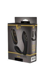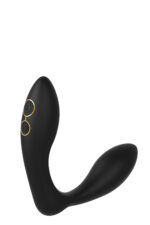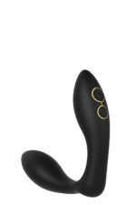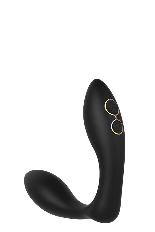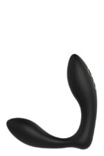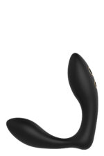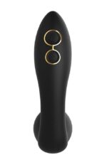Czarny stymulator ze stylowymi złotymi akcentami, zaokrągloną główką i elastycznym połączeniem między dwoma końcami.