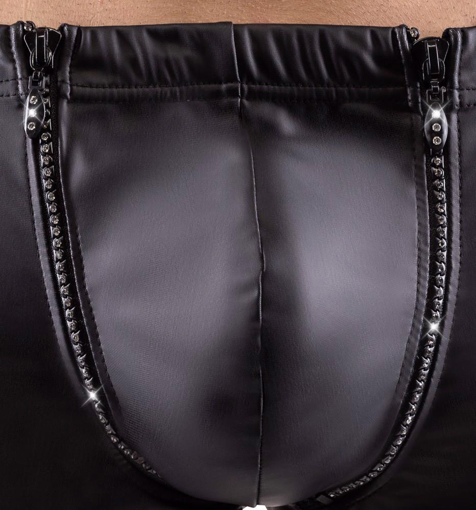 The figure-emphasising black pants from Svenjoyment are in a trendy matte look. The pants cling to the body in a sexy way. There is a padded rhinestone zip at either side of the pouch. The zips can be unzipped so that the pouch can be folded down. The pants are soft and stretchy for a very comfortable fit.