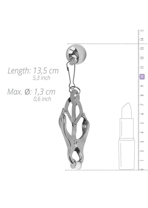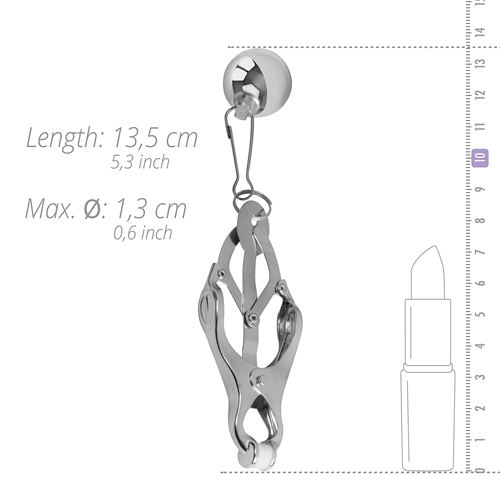 Te piękne metalowe zaciski na sutki z kolekcji EasyToys są gotowe do stymulacji najbardziej wrażliwych miejsc. Japońskie klamry wykonane są z mocnego i wytrzymałego metalu i mają miękkie osłonki ochronne na końcach. Małe kulki na spodzie ważą po 44 gramy i pociągają za zaciski, aby wywołać dodatkowe emocje. To sprawia, że zaciski na sutki są niezbędne w kolekcji każdego entuzjasty niewoli.Materiał Żelazo, StalWaga 130 gramKolor SrebrnyStymulacja Stymulacja sutkówSzerokość 3.50 cmDługość 13.50 cmMaksymalna średnica 1.30 cm